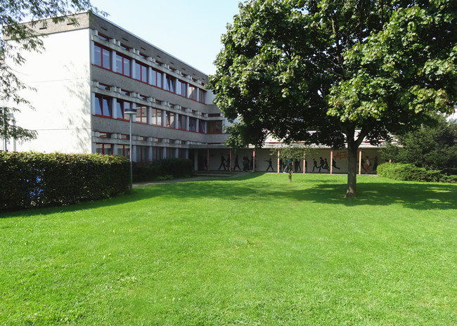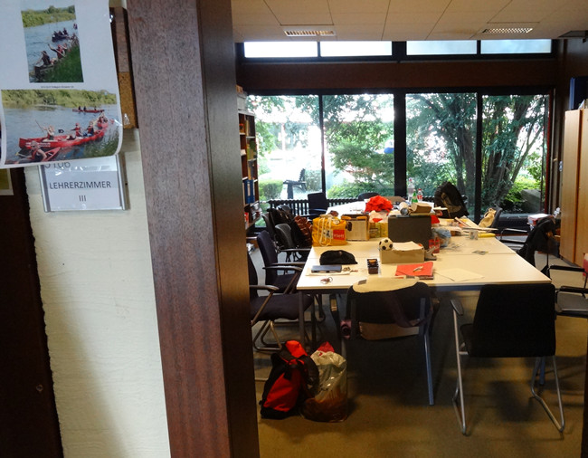 17号中午当我们抵达学校时,尤为简洁的校门吸引了我。没有名人题字,没有宽大的校门,只有几扇非常不起眼的玻璃门,上面用很小的字体标着学校的名称。天下着蒙蒙细雨,校长女士一个人打着伞亲自来迎接我们,没有任何排场,没有华丽的衣服,一切都觉得那么简朴,却因此也让我们很放松。在走进校门后必经的长方形大厅里简单陈设了一些学生的艺术作品,手写的公告栏,还有供学生留言讨论的简单的展板。我们后来了解到学校没有自己的校车,20号下午组织我们去科隆大教堂参观时全体师生一起做公交车去。