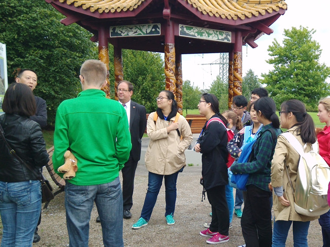 在德国北莱茵河上的勒沃库森市是德国重要的工业城市,也是极具个性的一座城市。在这个城市靠近莱茵河的一个公园里,有一处特殊的角落。这里标注着勒沃库森和友好城市无锡的距离为8785公里,这里还有一座无锡赠与他们的古色古香的亭子。我想我们与德国学校的友好缔结便源于此吧。