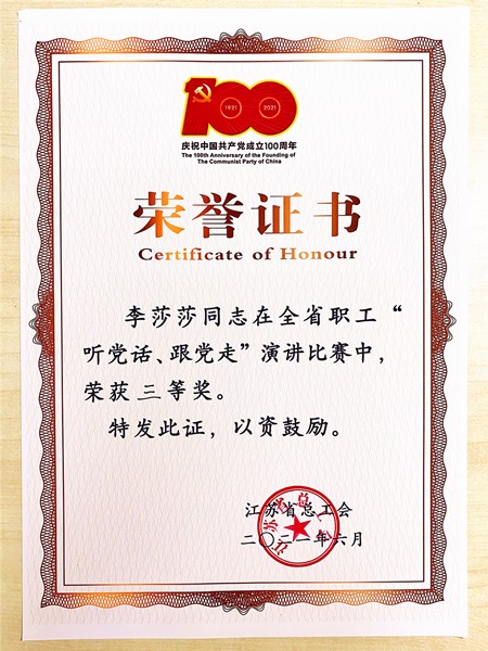经过激烈角逐,李莎莎老师最终获得省、市三等奖,并被聘请为无锡市“新时代 新思想 新宣讲”职工宣讲团成员。