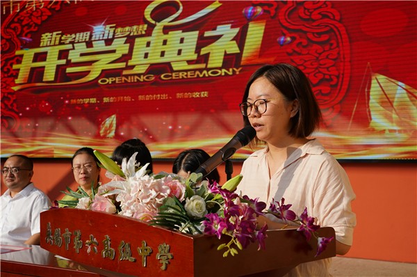 教师代表高二级部书记万吉莉老师向三个年级的同学们表达了新学期的祝愿和期待,希望同学们能各自制定新的目标,不负青春韶华,勇夺各阶段胜利。全体老师们也会一如既往,为同学们倾尽全力,提高教育教学的质量。