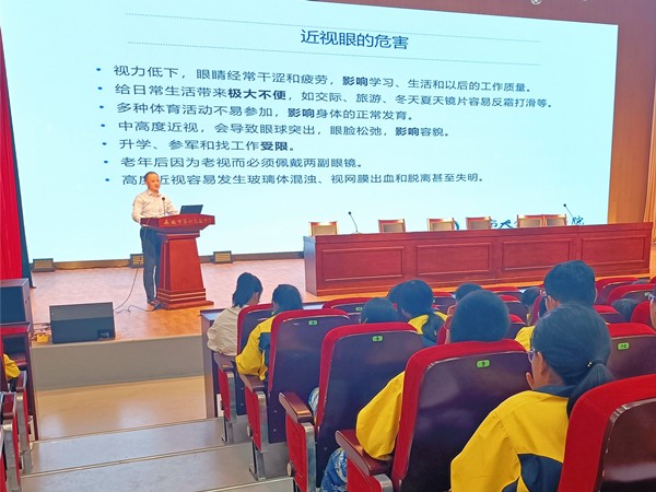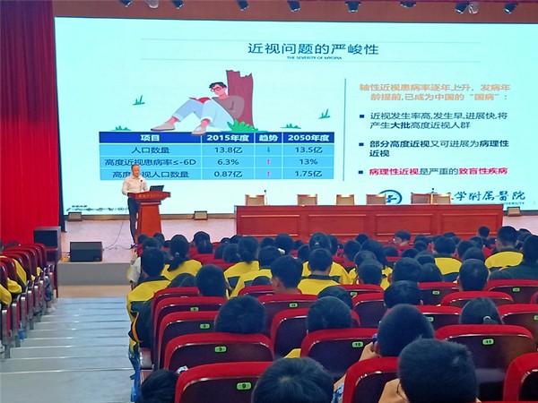 蒋医师从近视的临床表现讲起,详细地介绍了近视的发病机理、发病原因、近视的分类,并指出高度近视的危害性之大,提醒同学们要重视。同时,他还向同学们介绍了如何预防近视的有效方法,在已经发生近视的情况下医学是如何进行防控的。