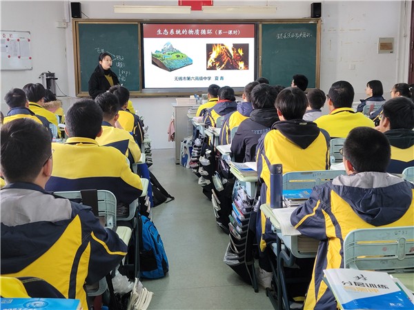 首先,是青年教师夏青老师精心准备的课《生态系统的物质循环》在高二6班进行。夏老师对新课标精神精准把握,很好地展现了新课标中对培养学生生物学核心素养的要求。本节课以“稻鸭共生”短视频导入,极大地调动了学生的学习兴趣,在教学过程中,以知识概念图的方式使教学内容简洁明了,直观易懂;采用两个活动让学生以小组为单位进行学习讨论,培养学生自主探究和小组合作能力。