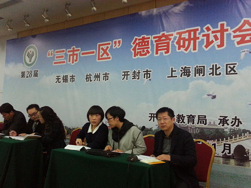 由无锡市、杭州市、开封市、上海闸北区合作举办的第28届“三市一区”德育研讨会于2013年11月17日在历史文化名城开封召开。在简短的开幕式上,开封市教育局卢玉强局长进行了致辞,他向我们介绍了开封的历史文化及教育发展,并阐述了本次研讨会的主题是“凝聚德育的正能量”。