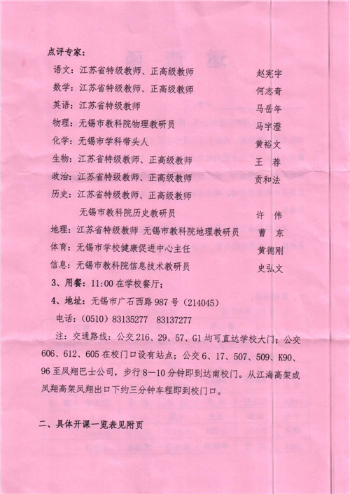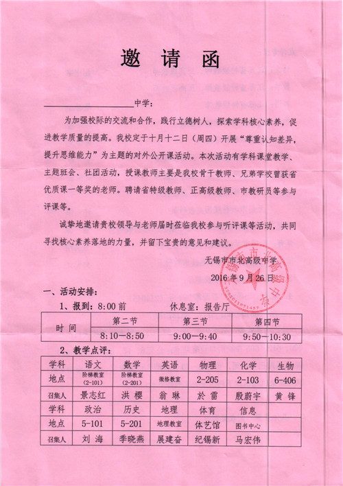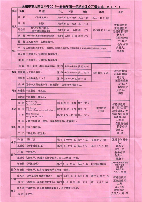 无锡市市北高级中学将于2017年10月12日(周四)举行对外公开课活动,欢迎我校教师前往参加听课、评课活动。(去听课的教师到教务处领取外出听课表并自行前往)
