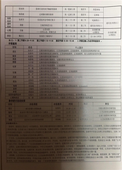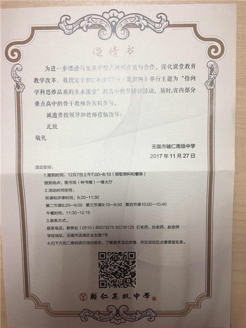 无锡市辅仁高级中学将于2017年12月7日举行对外公开课活动,欢迎我校教师前往参加听课、评课活动。(去听课的教师到教务处领取外出听课表并自行前往)