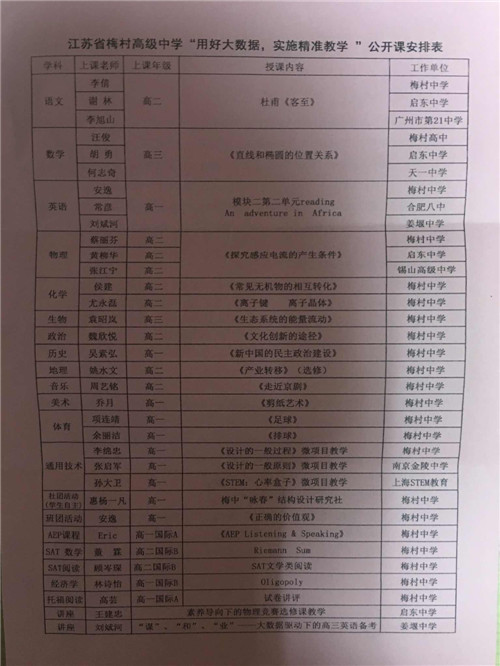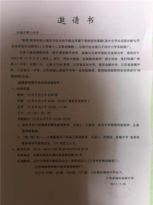 无锡市梅村高级中学将于2017年12月8日举行对外公开课活动,欢迎我校教师前往参加听课、评课活动。(去听课的教师到教务处领取外出听课表并自行前往)