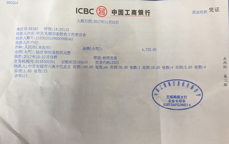四个支部共上交党费:6735元