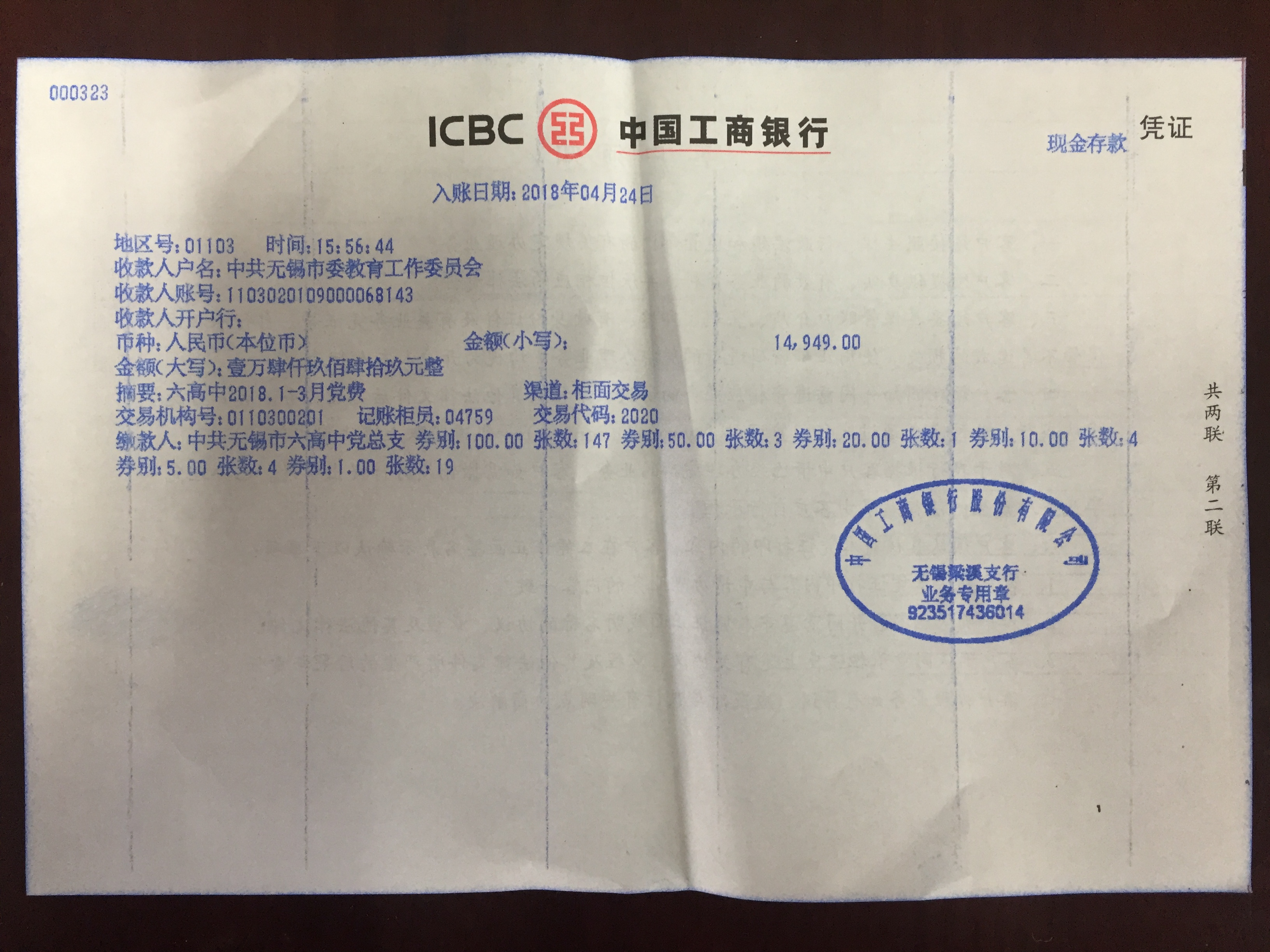 四个支部共上交党费:14949元