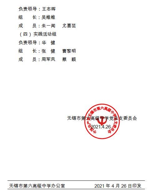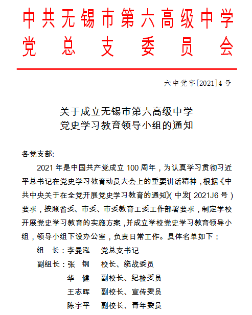 关于印发《成立无锡六高中党总支党史学习教育领导小组》的通知