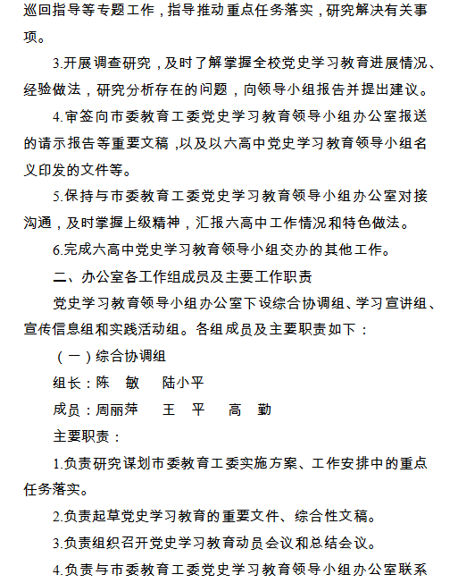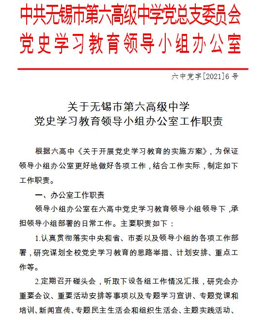 关于无锡市第六高级中学 党史学习教育领导小组办公室工作职责
