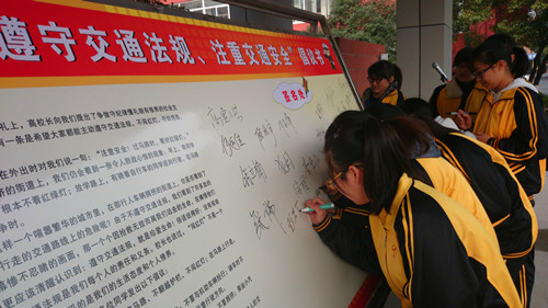 六高中的师生们以自己的实际行动庄重承诺,共同营造安全、文明的社会环境,实现文明出行、自律守礼、人人传递“正能量”。从每一位老师和同学们自己做起、从身边做起,集大家之力共同创建文明、和谐、有序、安全的交通环境。用自己的实际行动践行社会主义核心价值观,做一个守纪律、懂礼貌、有修养的社会主义合格公民。