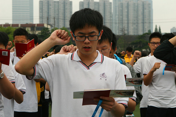 随后全体学子手捧《中华人民共和国宪法》和学校特制的感恩卡,在郑明秋书记的带领下面向国旗,庄严地说出了成人誓言。他们话语铿锵,表情肃穆,震耳欲聋的誓言久久回荡在校园上空。