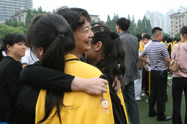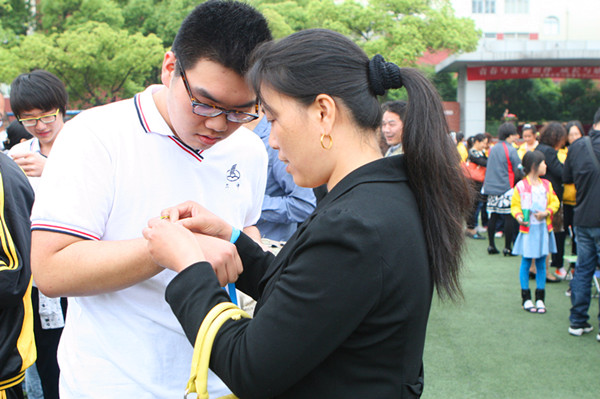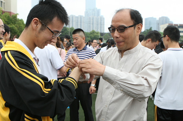 在后排观礼的家长此时也难掩激动之情。他们情不自禁地走到孩子身边,深情地为孩子系上代表幸福人生的七彩丝带。孩子为了感念十八年来父母家长的养育之恩,也帮亲人系上感恩亲情的蓝色丝带。此时间,浓浓亲情洋溢在校园,有些家长的眼中闪出点点晶莹。