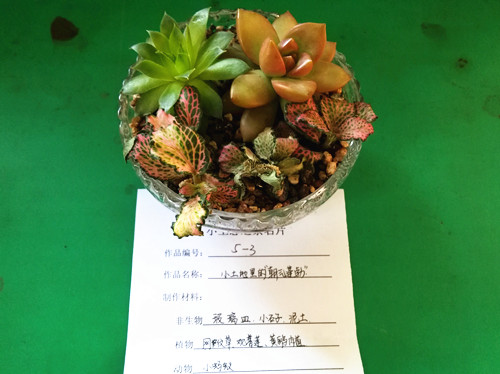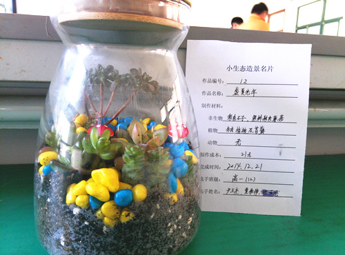 在生物实验室,每一件学生们亲手打造的作品,都被详细记录上了它的名称、制作材料、成本、花费时间和制作人姓名。一个个造型新型、别具匠心的生态微景观在同学们的无限想象中被赋予了新的意义。
