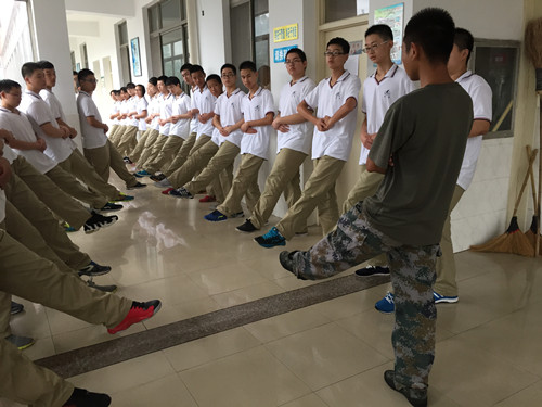 在教官们的带领下,一个个方阵紧张而有序地训练着,豆大的汗水从同学们的头上缓缓流下,衣服早已被汗水湿透,但每个人都在咬牙坚持,团队的每个成员都在相互激励,高一7班白清远同学为了班级军体拳能快速提高,放弃自己自己休息时间,一对一帮练同学。高一8班周昕同学军训口号响亮,有很强的组织能力,大家都称他为“副连长” 。高一6班宿瑜信同学主动请缨担任军体拳口令员,协助教官指导同学拳击,直至嗓音沙哑,仍尽全力做好口令员工作,班级方队训练中仍主动帮助同学纠正动作。