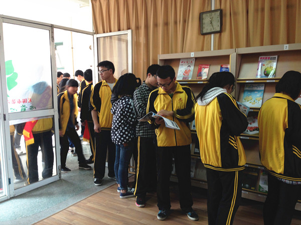 学生排队等候,阅读心理杂志