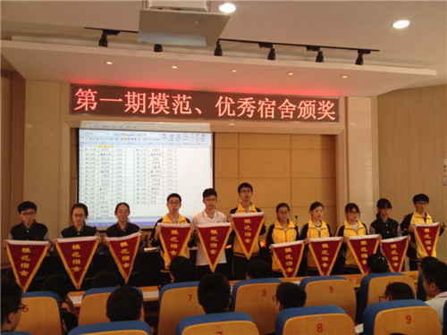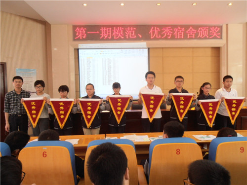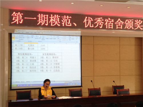 会议首先由德育处张枫副主任对开学以来住宿生管理进行了小结,对学生们提出了更为具体细致的要求,包括请假制度规范、卫生纪律规范、住宿财产使用要求、晚自修学习要求、各个时间段的任务要求等方面。张副主任对第一期模范宿舍、优秀宿舍、模范舍长、优秀楼层长进行了表彰,并且为获奖宿舍颁发了锦旗。模范宿舍高二6班的学生代表武奕同学就她们宿舍的学习生活、卫生纪律、和谐奋进等方面与大家分享了了她们的一些做法和今后的目标。