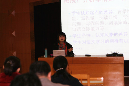 本次活动还特别邀请到上海师范大学的郑桂华教授来校。她首先给我们带来了一趟精彩的作文构思课。课堂环环相扣、逻辑严密,学生在这高密度的思维训练中生成“打开作文思路”的能力,让众位老师见识到了什么叫“生成课堂”。下午郑教授还为大家做了主题为“如何提高教学的有效性”的讲座,结合教学案例、数据分析,重点谈了如何针对学情,找到学生的起点,及可能发展的空间,在其中有所作为。一堂课、一次讲座,让老师们领略到了一位名师的激情与严谨。
