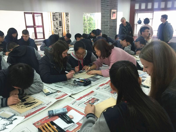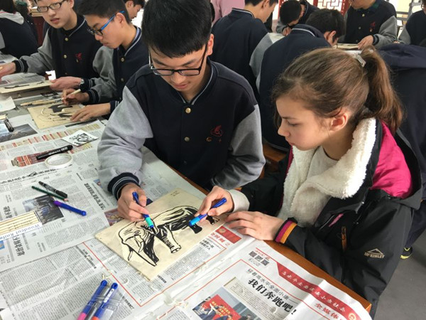 曹老师先展示了版画制作过程以及如何正确掌握刻刀方法,德国学生与我校学生合作共同完成了一幅版画作品。整堂课教学氛围很高,学生兴趣高涨,师生互动,学生相互交流,学生们也和外国友人得到了近距离交流。