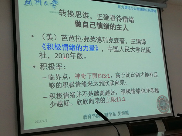 吴继霞教授的《高中骨干教师压力的自我调节》更是从实际出发,句句击中老师的工作实际。特别是一个个生动的案例、一条条中肯的建议,吸引了学员们注意,为学员们指点了迷津。