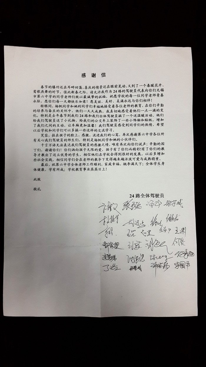 转眼间,杨帆同学和她的同学们幸福地接受着各位老师的教育,在你们辛勤的培养与备至的关怀中,他们一天天成熟,我真切地感受着他们一点一滴的变化,特别是去年春节到我们24路和我们全体驾驶员搞了一个送温暖活动。他们给我们驾驶员送了小礼物,给我们的公交车上装饰了一些小饰物和贴纸,增加了我们之间的互动,让车厢更加温馨!我们驾驶员感受到同学们的热情,希望以后学校和同学们可以多搞一些这样的交流学习。