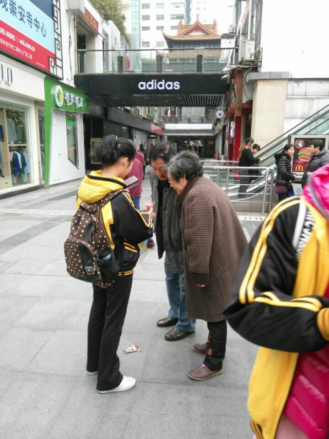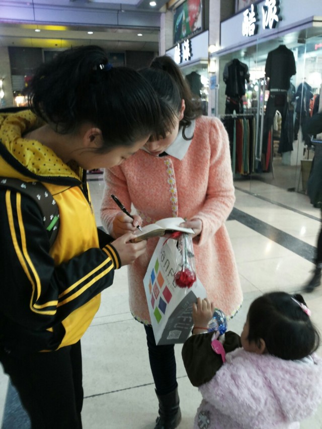 改变了策略,我们的活动果真很受欢迎,当路过一个婚纱摄影是,那的工作人员也同我们热情的交流,可能我们太热情有许多人都来看我们的活动。有一个一家三口出来游玩,我们送给她献花并让她写上祝福时,她是那么的热心,那么的欢乐!