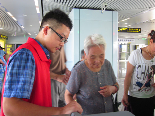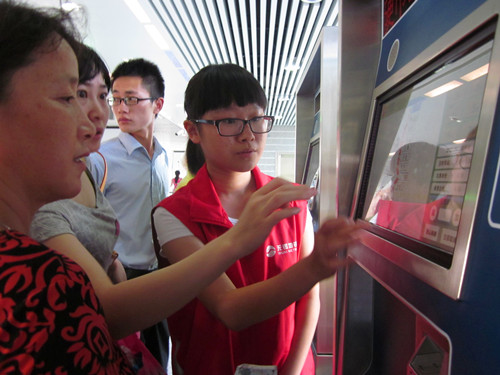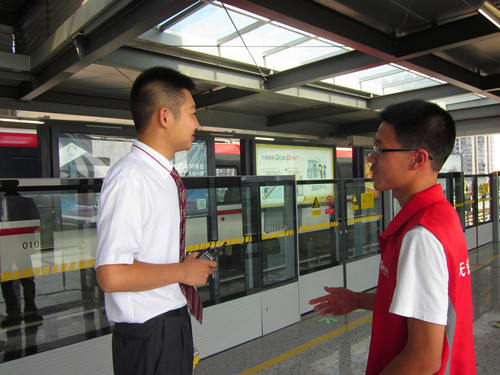 我们先前往地铁服务站签到,然后换上了地铁志愿者专用的标识服装,随后根据地铁工作人员的指挥分别分散到自动售票机、进出闸机口、站厅扶梯口、上下行站台等岗位。我们指导乘客使用售票机正确购票;提醒乘客右手持票按顺序进出闸机小孩在前面;引导乘客上下扶梯到达离他们最近的出口;检查车厢、让乘客不要站在黄线以内。