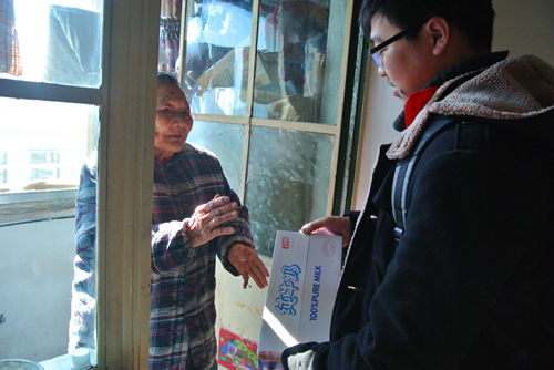 在团支书薛之能的带领下,志愿者们来到了老太家。这位老太和他的女儿及女婿住在一间狭小的公寓里。老人年纪很大了,听力不大好,看见我们来,她很开心。脸上一直洋溢着笑容。我们陪他们聊天,帮他们简单的炒了几个菜,最后向他们拜了个早年,并送上了我们的一点心意。我们由衷的希望他们身体健康,万事如意。