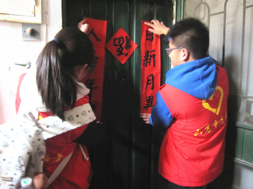 新春即将来临,在书法家的指导下我们写了不少对联和福字,把这些尚且稚嫩但饱含真挚情感的对联和福字送给了沁园社区的老人们,并且帮他们贴在了家门上,让这个有点年纪的老新村在新春佳节也显出喜庆和活力。