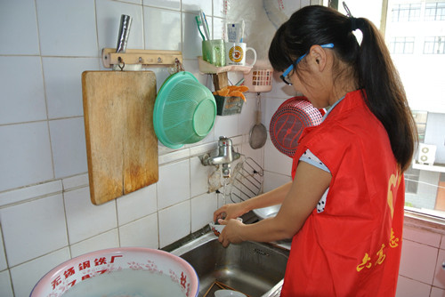 这位老太已有94岁高龄,行动不便,听力也不太好,老太和她的女儿女婿住在一起,公寓虽不大,却很温馨。初见时,老太坐在藤椅上晒太阳,见到我们很高兴,想要起身,志愿者连忙跑去搀扶,陪老太聊天解闷,帮他们摘菜做家务,并向他们送上了祝福语和一些心意。我们由衷希望他们身体健康、天天顺心。
