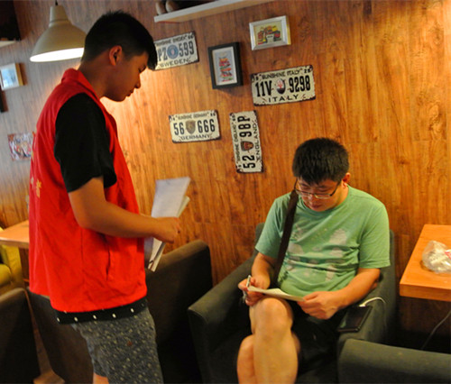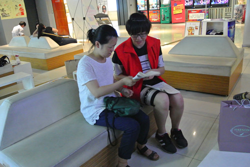 因为是周六,我们选在了人流量较大的茂业百货及附近地区。早上十点,志愿者们穿上红马甲,拿着问卷和宣传纸开始行动起来。一开始,大家都有些畏畏缩缩的不敢上前,这是有路人凑过来看我们手中的调查问卷,我们顺水推舟送出第一份问卷。有了成功的第一次,志愿者们信心渐渐足了,慢慢的也放开了:脸上的表情从紧张到自然到最后的满脸微笑,每个人都顺利完成了任务。将近十二点的时候,问卷和宣传纸已经全部发放完毕。