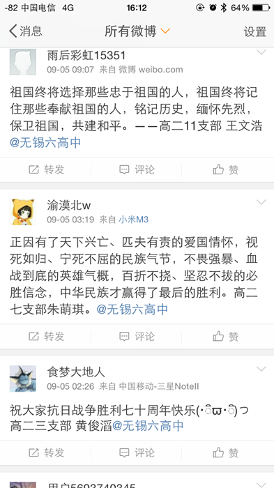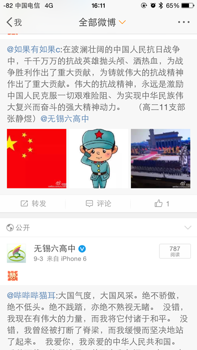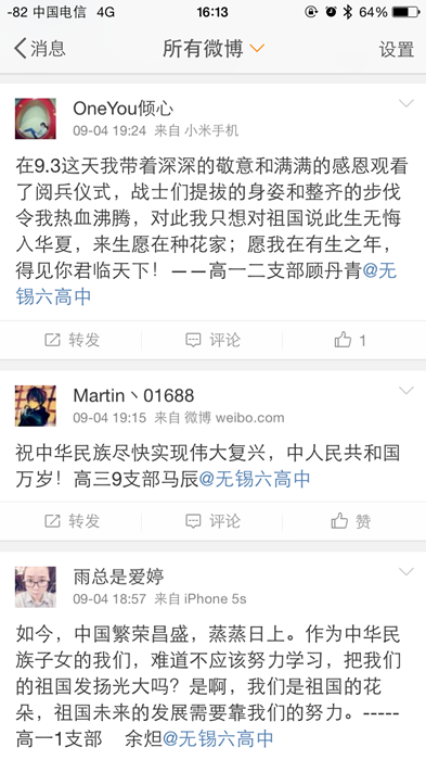 9月3日至5日,适逢抗战胜利70周年阅兵式,在学校团委的号召下,六高中的团员青年们以“纪念抗战胜利的微感悟”为主题,以微博互动这一种自媒体时代的表达方式,撰写一条阅兵式观看感悟的微博并与学校官方微博积极互动,来展现新时代团员青年纪念抗战胜利、缅怀革命先烈、歌颂伟大祖国、感受中华民族的伟大复兴。活动期间共计发布微博互动450余条,占学校团员总数的近一半。