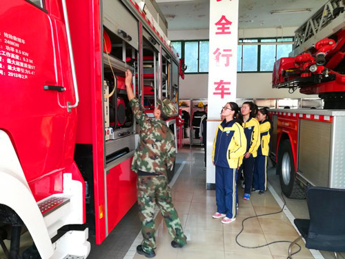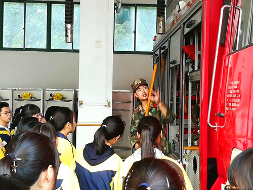 在消防官兵的带领下,同学们进行了各类消防车的参观,学习了不同的消防车所具备的不同功能,了解了消防车的特点、随车器材的主要性能与使用方法。有的同学还感受了部分器材的重量,真切体会到了消防官兵灭火工作的艰巨与不易。之后,同学们跟随官兵的引导参观了他们的宿舍、盥洗室、会议室等地。不少同学对他们整洁干净的内务吃惊,不管是整齐的“豆腐块”还是按序摆放的水杯都能让大家感受到消防部队严肃的纪律与他们对待工作严谨的态度。