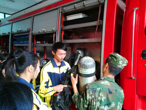 接着,消防员向我们演练了遇到紧急救援情况出发前的一系列准备工作。从滑杆划下到穿上战斗服再到跑上车,一气呵成,就是在与时间赛跑!如果没有极强的使命感和把救援放在同自己生命一样重要的地位,是不可能快速完成这一系列动作的!在感叹他们动作流畅、迅速的同时,我也发自内心的钦佩他们,真心为他们点赞!