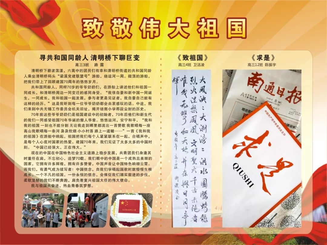 迎着新中国成立70周年的盛世,纪念五四运动100周年的契机,学校以“党团手拉手”为载体,面向全体师生开展了“致敬伟大祖国”诗文绘画摄影创作活动,并在校园橱窗栏集中展示,呈现出六中人的精神风貌和艺术素养。