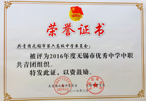 热烈祝贺学校团委获评2016年度无锡市“优秀中学中职共青团组织”。