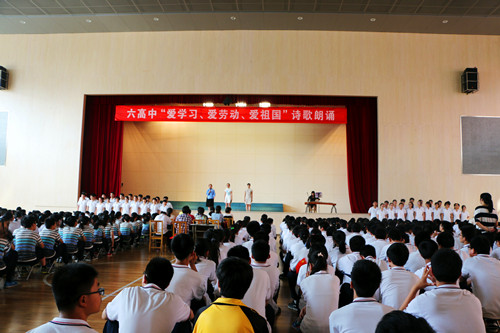 2014年12月举办以“爱学习、爱劳动、爱祖国”为主题的高一年级诗歌朗诵大赛。选手们或激情洋溢地抒发了华夏儿女的爱国热情,或踌躇满怀地喊出了奋发青年的远大抱负,或声情并茂地表达了对父母师长的感恩之心。台上选手以诗言志,激情迸发,台下学生呼号助威,共同发出心底的最强音:热爱祖国,热爱生命!