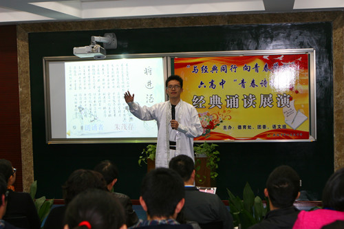 3.校本课程走进学生心中。2014年6月编写无锡市第六高级中学校本课程之一《诗歌朗诵选读》。目前。高一新社员每周进行诗歌朗诵的培训。