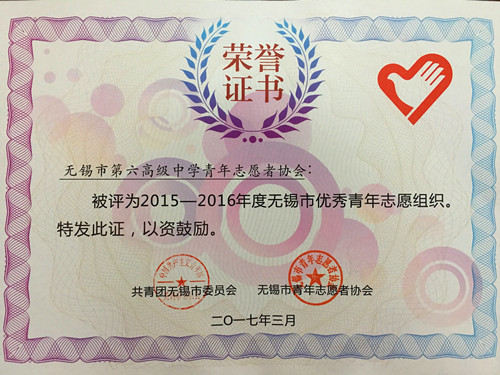 热烈祝贺学校“青年志愿者协会”获评2015-2016年度无锡市优秀青年志愿组织。