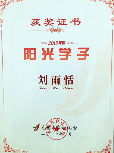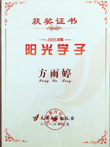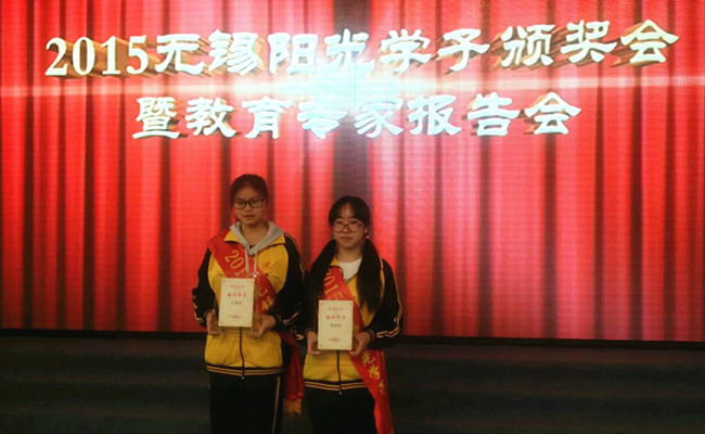 热烈祝贺我校方雨婷、刘雨恬两位学生获得无锡市2015年度 “阳光学子”荣誉称号,希望以此激励更多的学生学习身边的榜样,提高自身素质,全方面发展,获得更多的荣誉!
